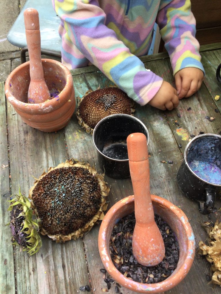 In our garden we have a mud kitchen, sand and water play, an area for digging and exploring, a mark making area and a house for role play activities. The children have access to storage holding resources that can be adapted and developed to reflect their ideas.